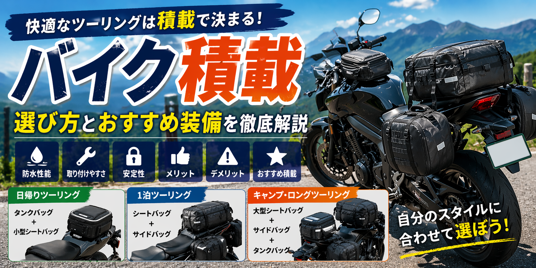しっかり準備して積載を整えれば、バイクの楽しみ方は一気に広がる。無理に詰め込みすぎず、自分に合ったスタイルを見つけて、快適なツーリングを楽しんでほしい。